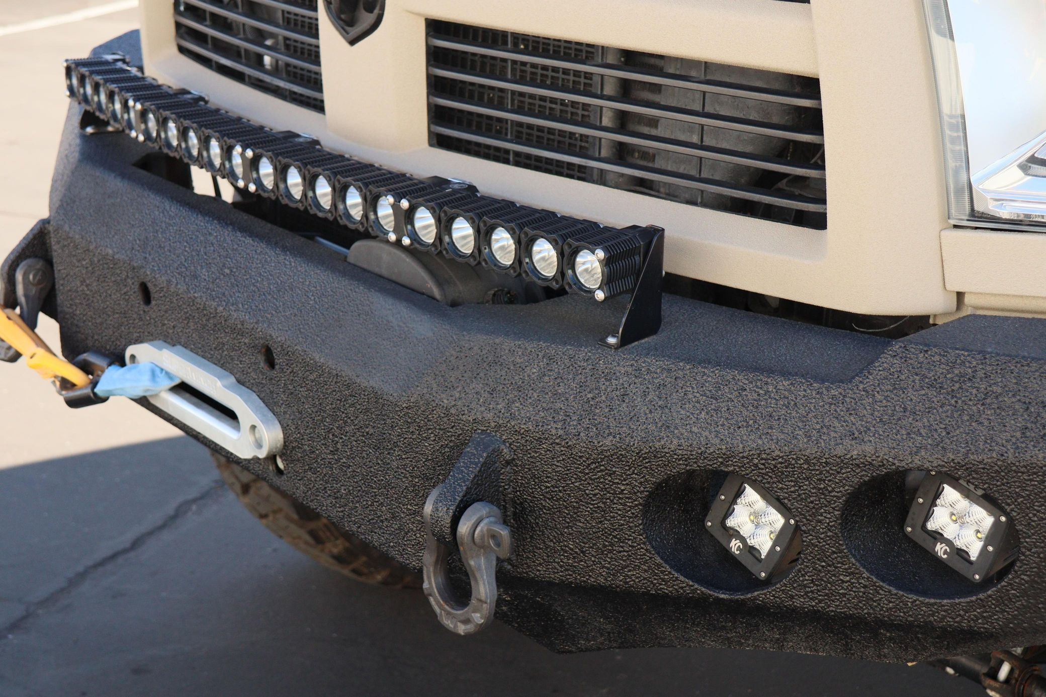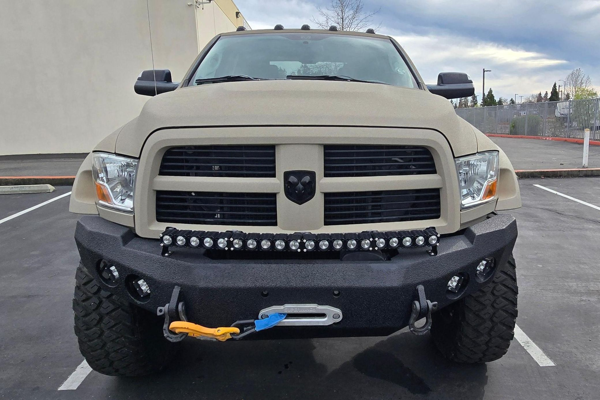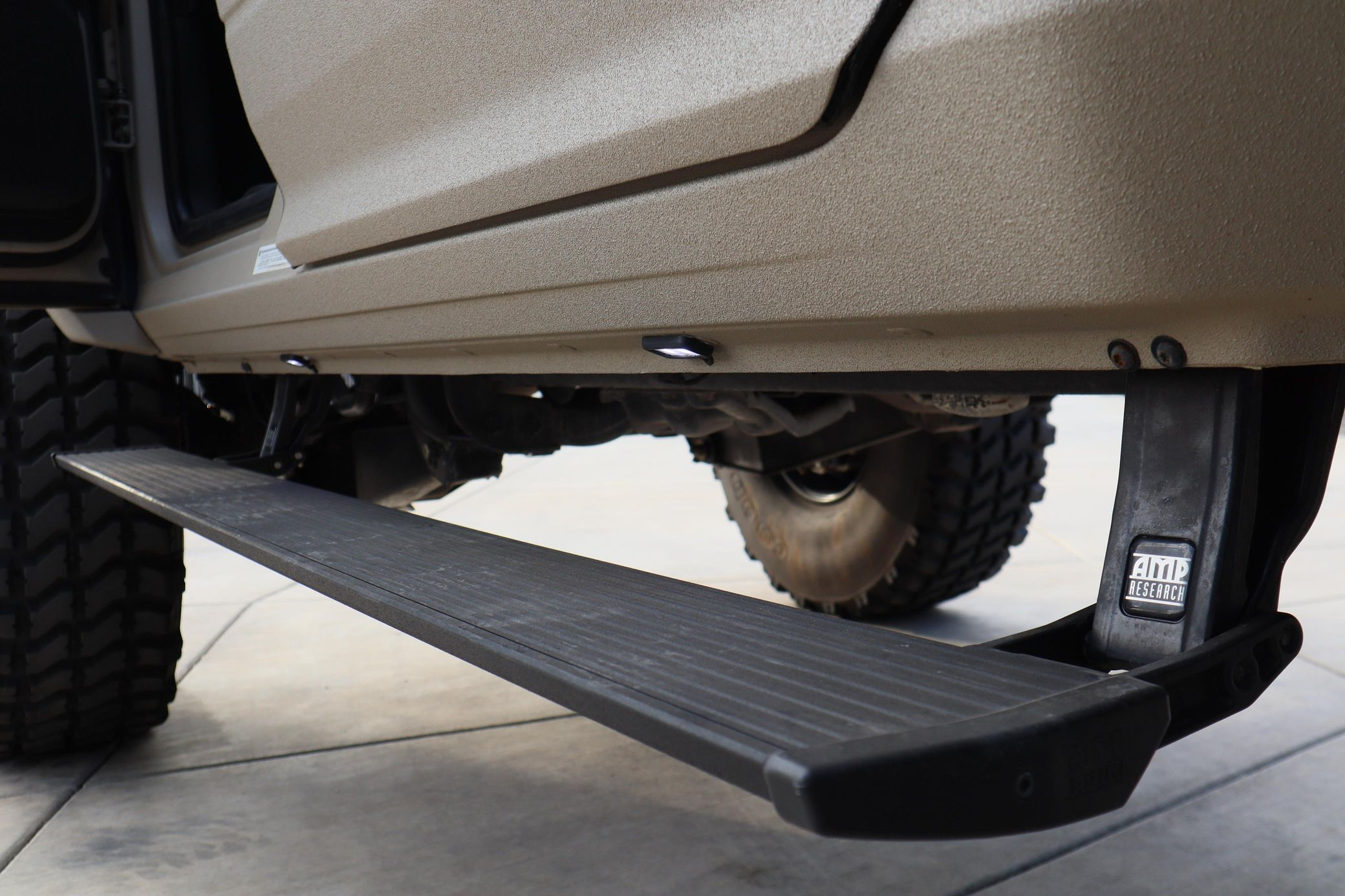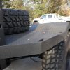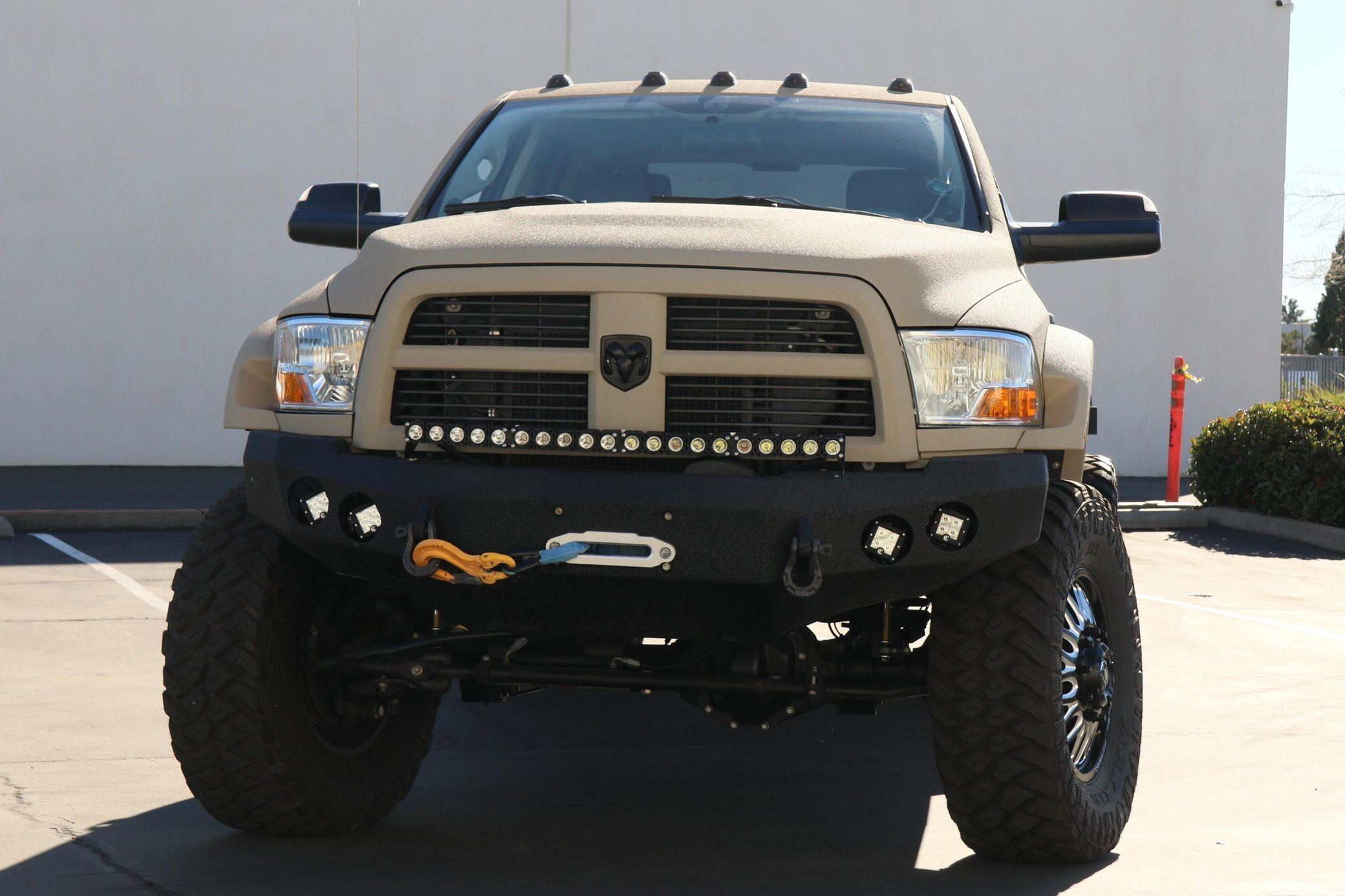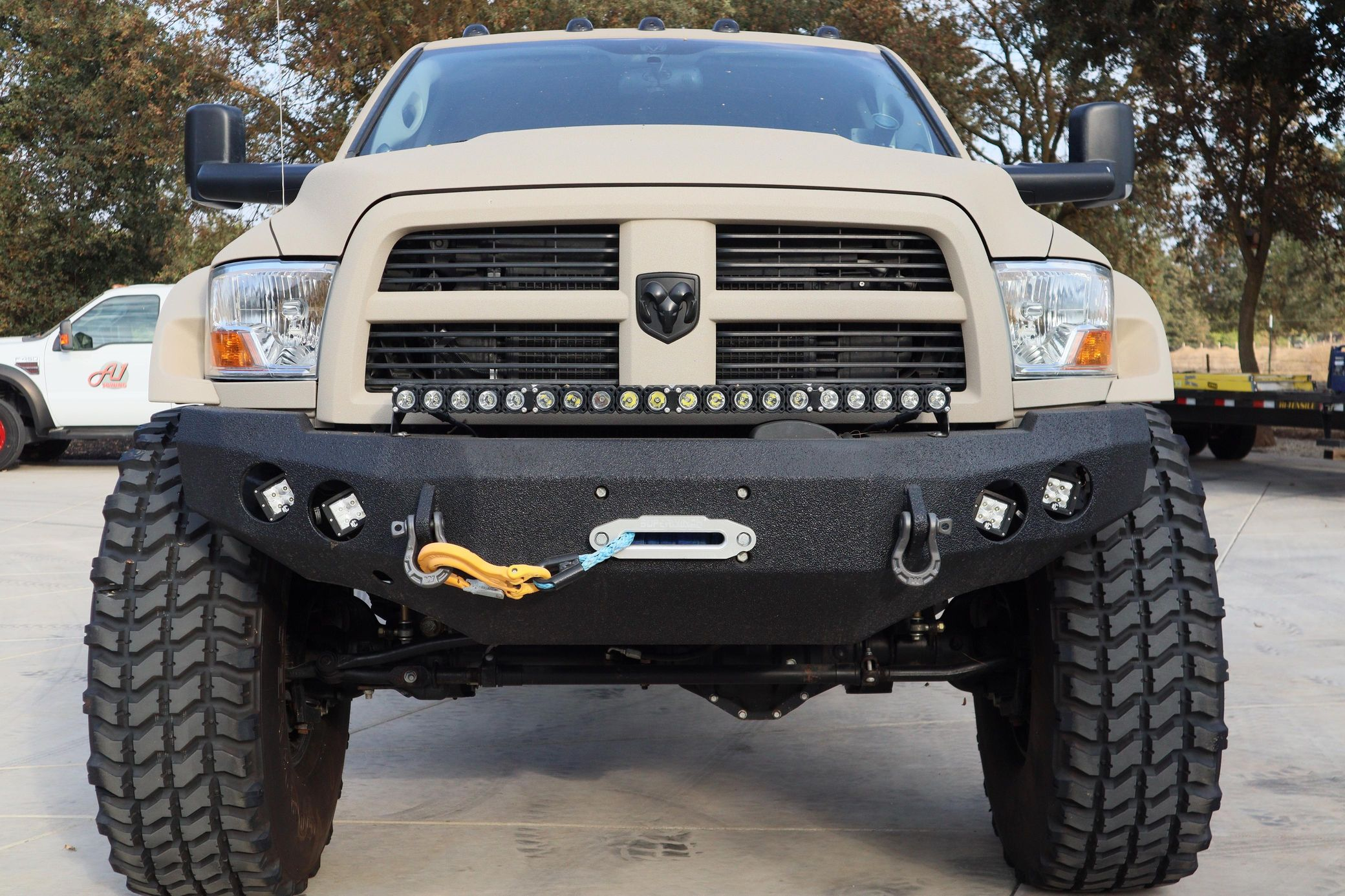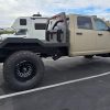 - Exterior: Repainted Mojave Tan Starwood finish. Custom steel front bumper with 40″ KC light bar, winch, and Warn D-rings. AEV fender flares, AMP PowerStep, aftermarket flatbed with rack and chocks.