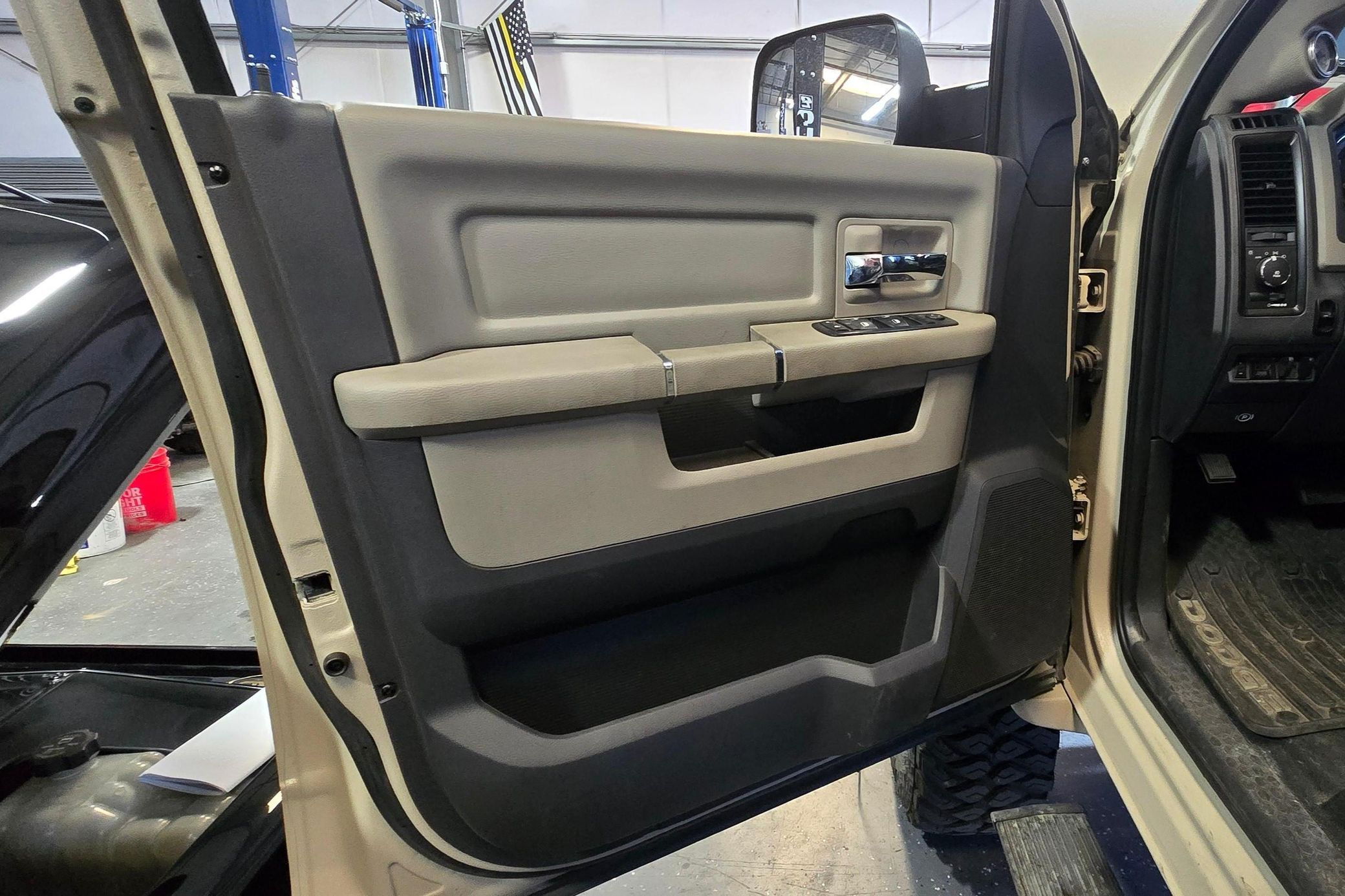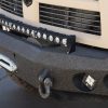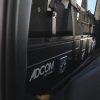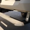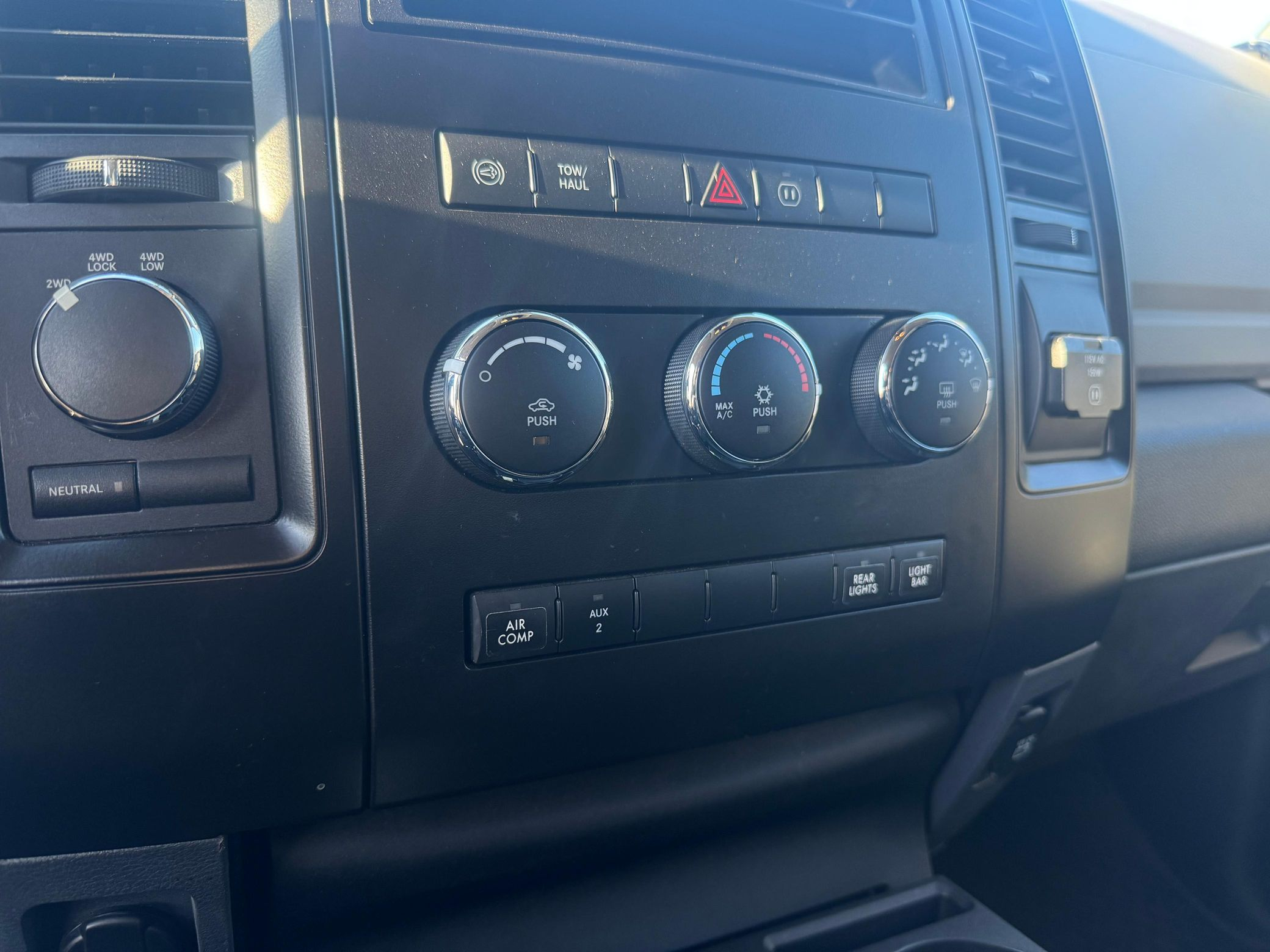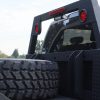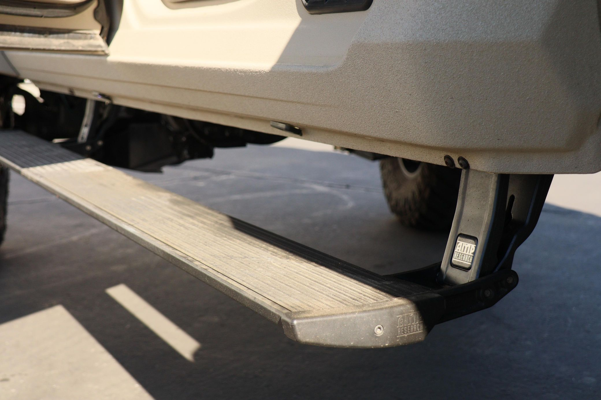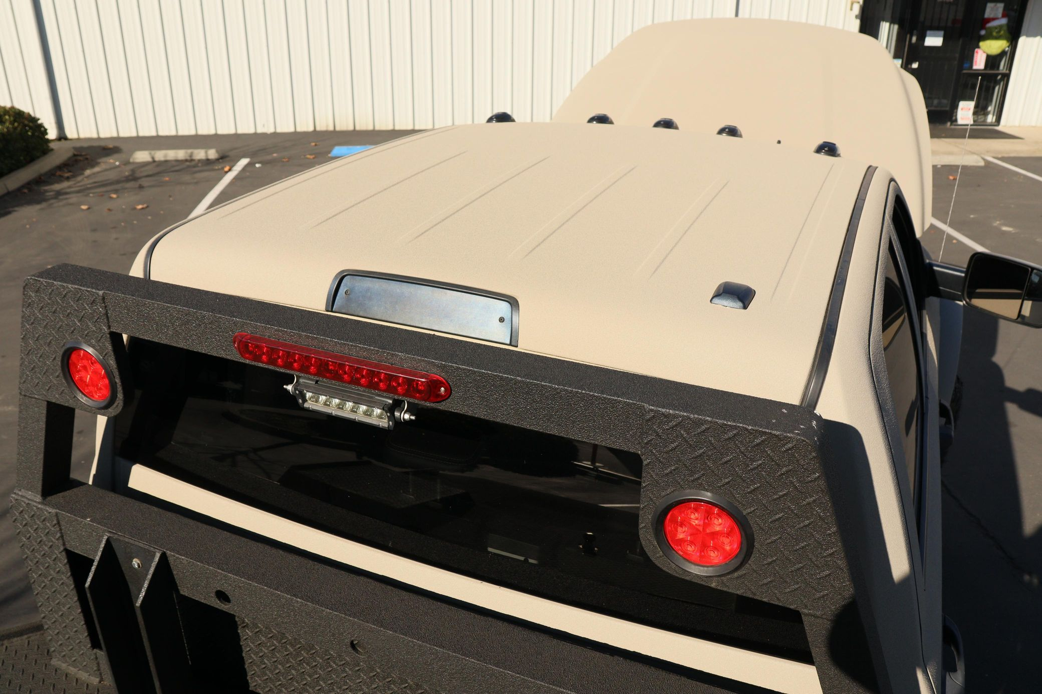 - Exterior: Repainted Mojave Tan Starwood finish. Custom steel front bumper with 40″ KC light bar, winch, and Warn D-rings. AEV fender flares, AMP PowerStep, aftermarket flatbed with rack and chocks.