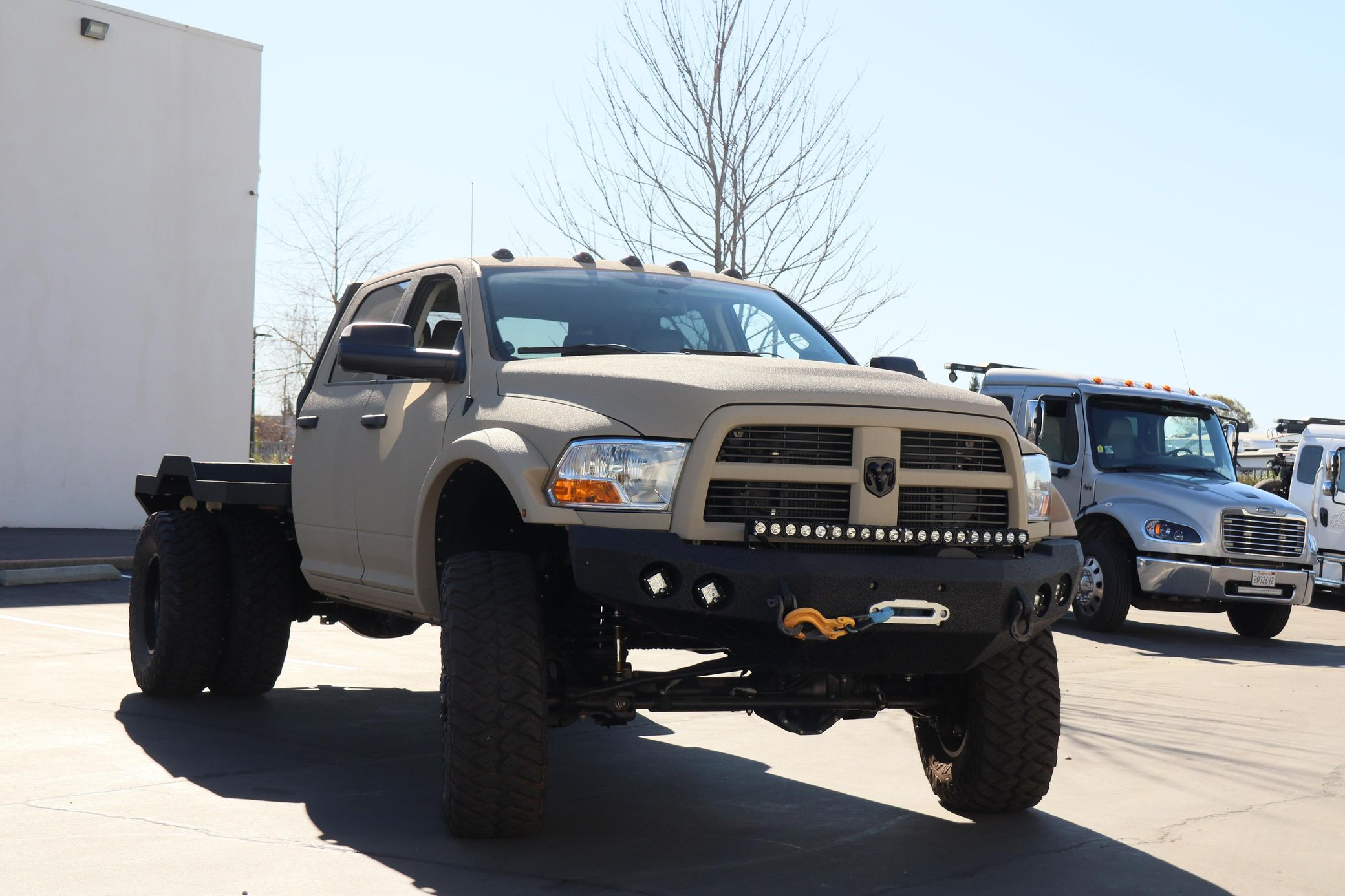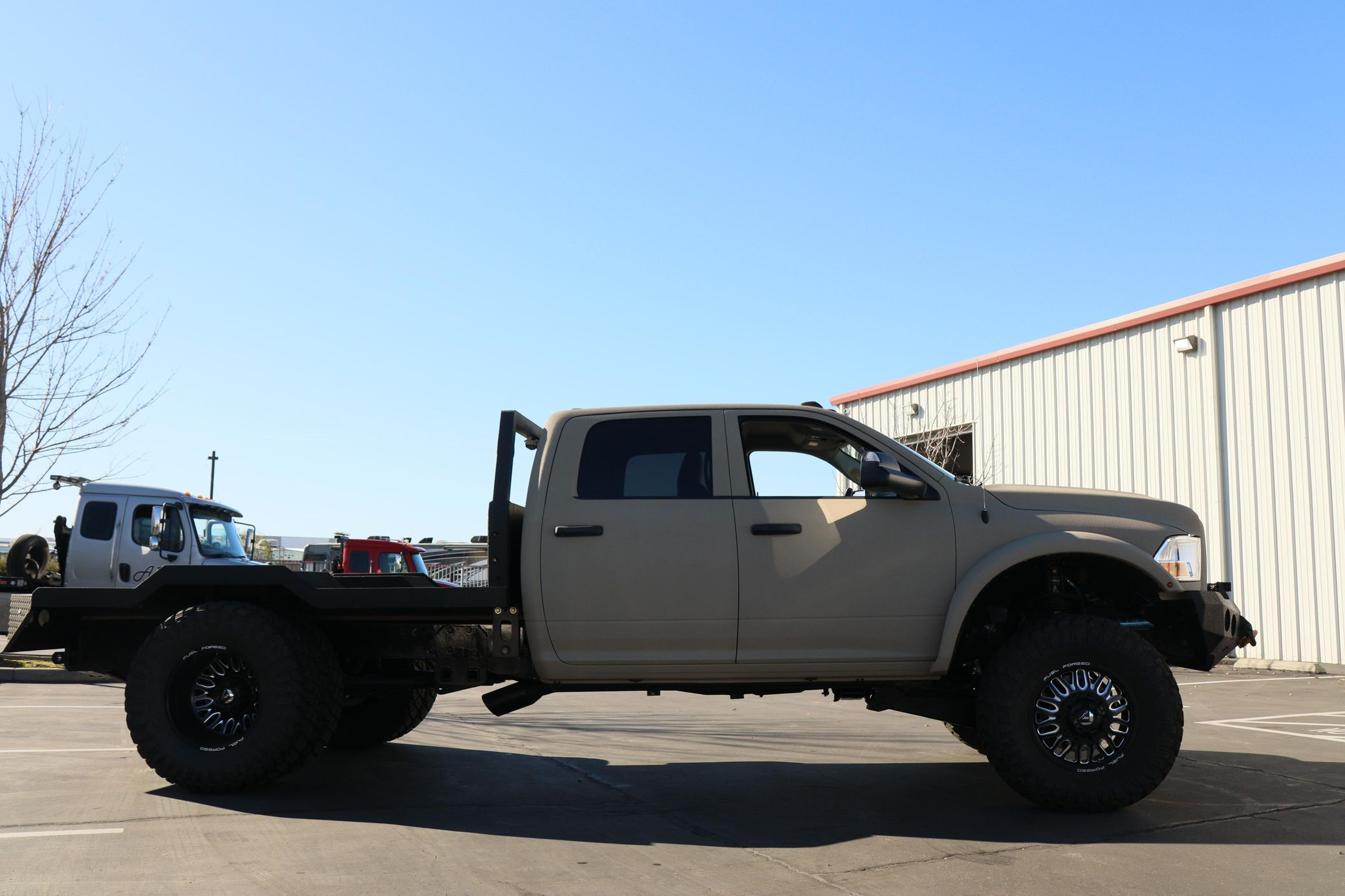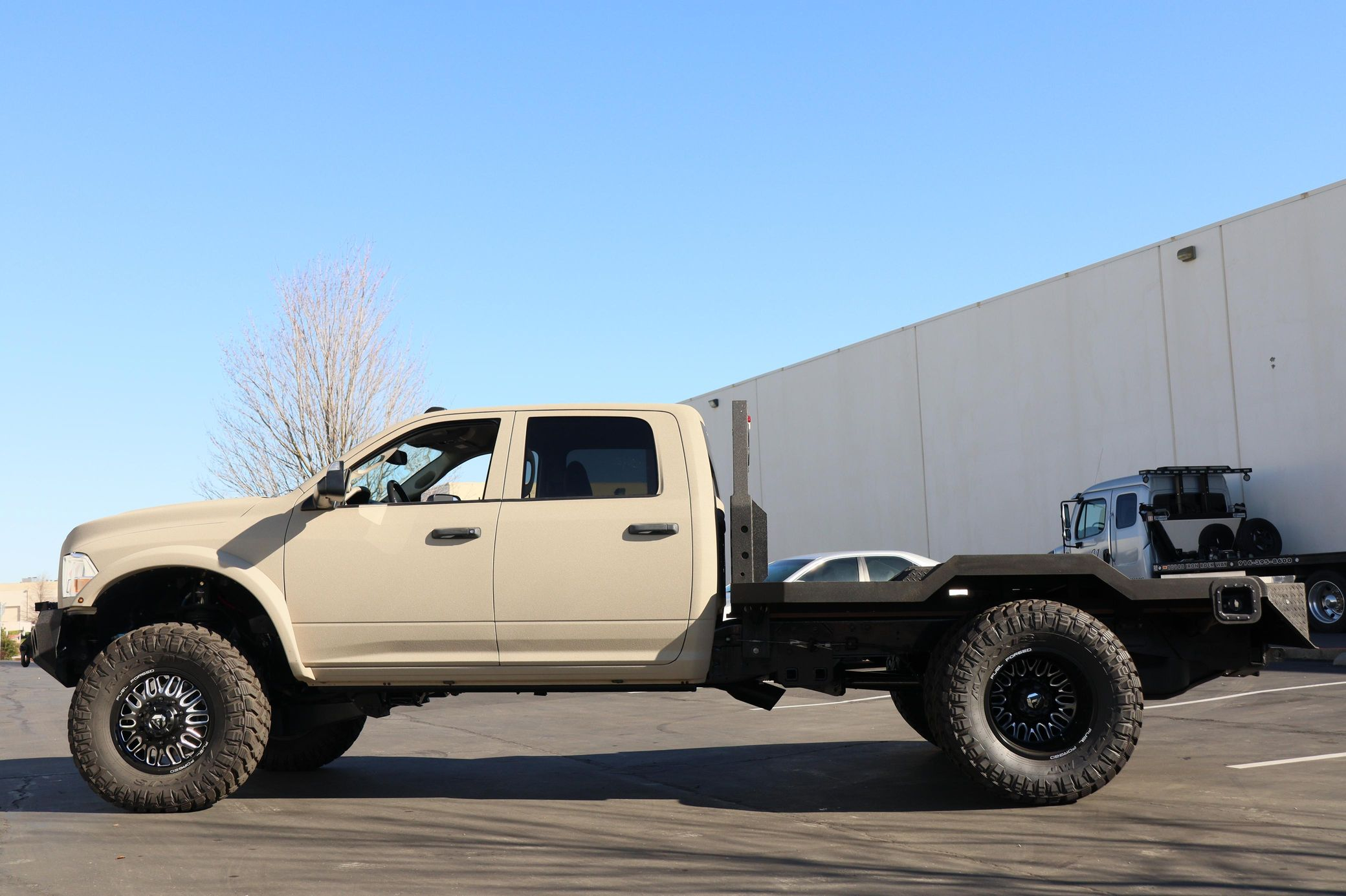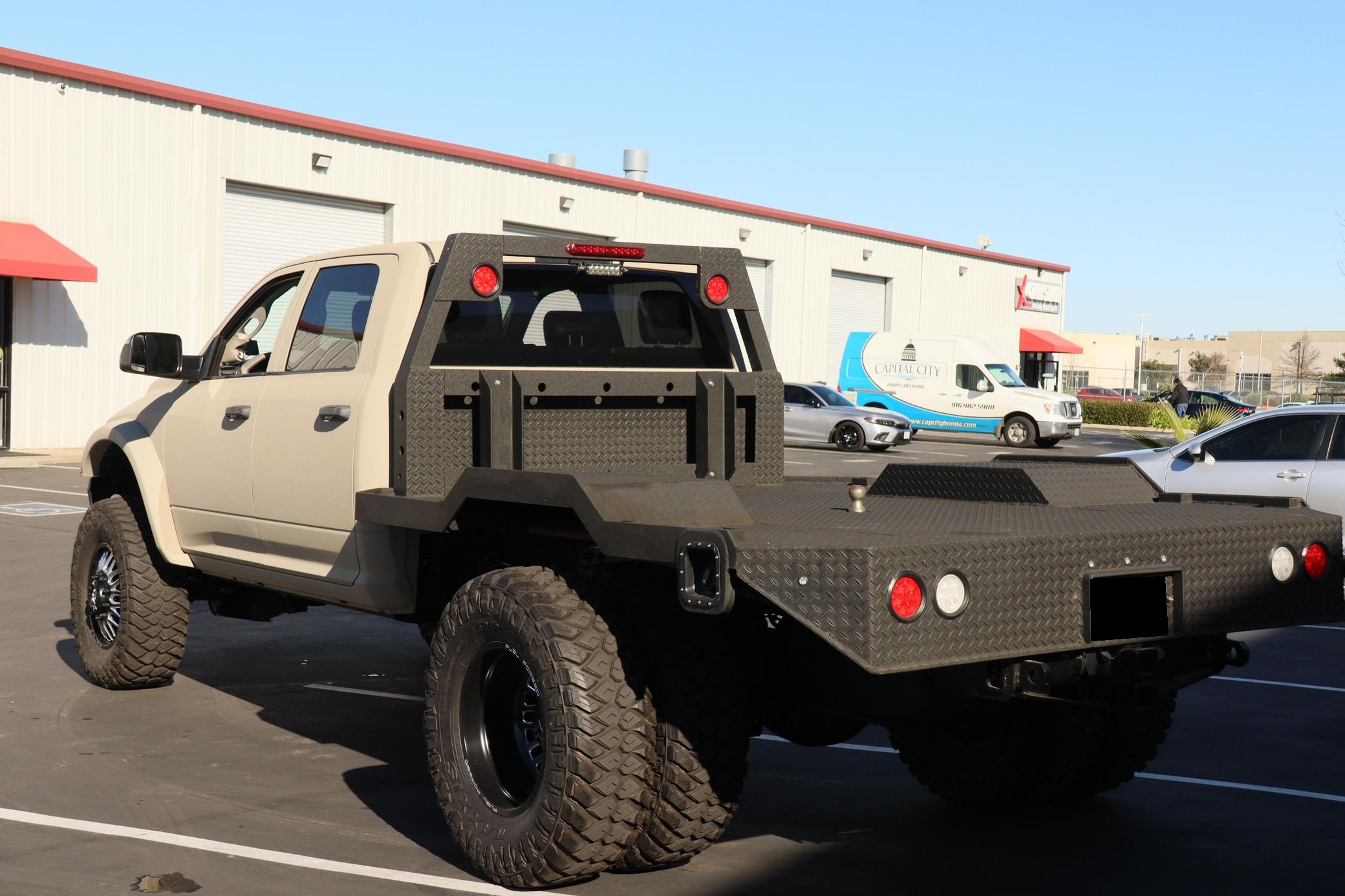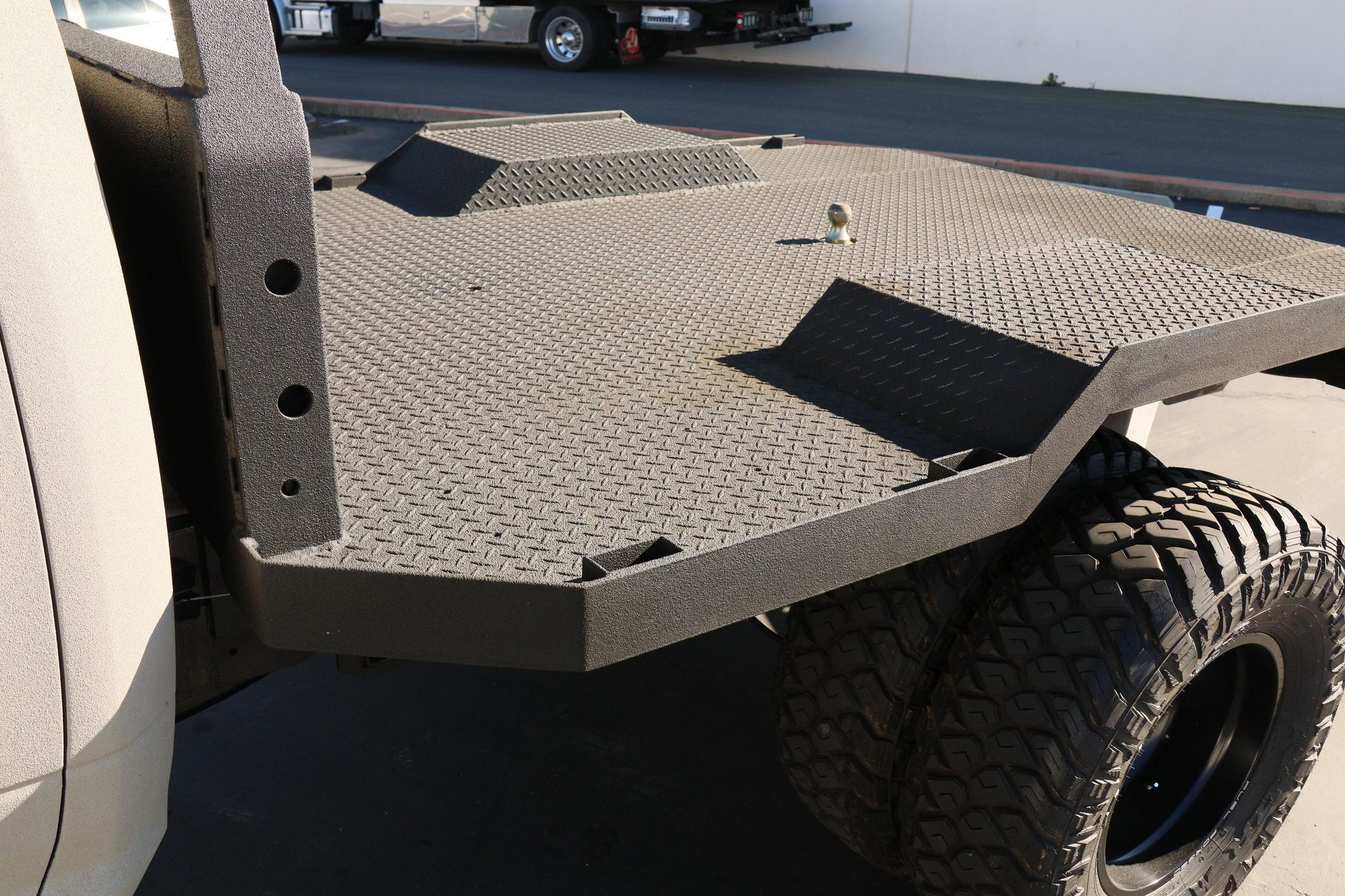 - Showcasing a custom flatbed and aggressive off-road stance